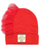 Beanie model hat with folded edge, sewn logo label on the edge and tulle ruffle applied on the side.