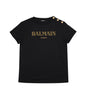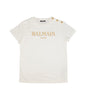 Balmain Kids cotton T-shirt, crew neck, short sleeves, lettering logo on front, straight hem, gold button closure on left shoulder.