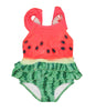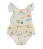 Molo Nalani one-piece swimsuit in recycled fabric with UV 50+ protection. Brand's iconic smiley face print pattern embellished with ruffles on the hips.