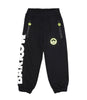 Barrow Kids sporty cotton fleece pants, elastic waistband, front pockets with contrasting vertical zipper with iconic Smile logo slider. elastic cuffs. Contrast printed lettering logo on right leg, Smile on front of left leg, reflettering logo on back.