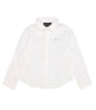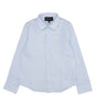 Light blue linen Emporio Armani Junior shirt with Italian collar, full front button closure, long sleeves with double-button cuffs, rounded hem, regular fit, embroidered logo on left chest.