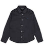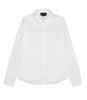 White-colored cotton-blend shirt. Straight design, classic collar, long sleeve and curved hem.