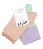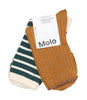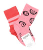 Two pairs of ribbed socks. One pair is in pink with a smiley face print and the other is in red with pink stripes. This product is Oeko-Tex certified.