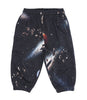 Molo Adan plush cotton GOTS-certified sport pant with elasticated waistband and drawstring, flush side pockets, flush back pocket on right side, all-over satellite and planet pattern, tapered leg with elasticized cuffs, regular fit.