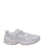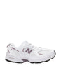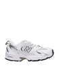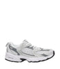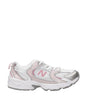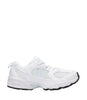 New Balance Kids model 530 sneakers. Mesh fabric upper with leather inserts, logo tab, adjustable woven fabric lace-up closure. Rubber sole. Logo on sides, patch on back heel with logo.
