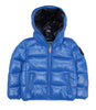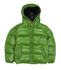 Save The Duck Kids Artie jacket, made of technical fabric, quilted line with hood, zippered side pockets, Lycra trim on cuffs and bottom, full zipper closure at hood, orange-colored zipper pull, rubber logo applied on left sleeve.