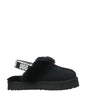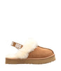 UGG Kids Funkette sabot with slip-on silhouette featuring an elasticized strap at back with graphic UGG logo. Made of premium suede leather lined with sheepskin.