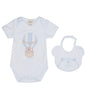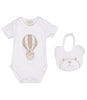 Nanan cotton bodysuit and bib set, with teddy bear on balloon on front, bottom fastening with snap buttons, short sleeves. Bib shaped as a teddy bear face with ears, drawstring closure and snaps