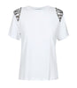 Alberta Ferretti crew-neck, short-sleeved cotton T-shirt with appliques on the shoulders and logo tag on the back. The model is 1.75m tall and wears an S.