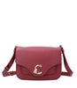 Coccinelle C-Me small shoulder bag model with flap and gold metal C-Me logo placed on front, silhouette with curved edges.