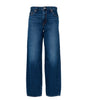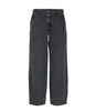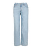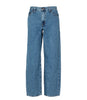 Levis Baggy Dad denim jeans, five-pocket model, mid-rise waist with belt loops and Levi strauss label on back, zipper closure with flap and custom metal button, red label applied to back pocket edge, wide leg, loose silhouette on hips and thighs that cinches at ankle, straight hem.