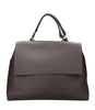 Orciani Sveva Soft Grande bag in grained leather, model to be worn by hand or with the buckle-adjustable and removable shoulder strap, with handle on the top edge, retractable slot to access the inside of the bag without opening the flap, zippered inside pocket, inside pockets, one of which is zippered. Flap and magnet closure, lettering logo in palladium finish.