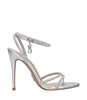 Steve Madden Bryanna sandal made of faux leather with metallic finish, model with stiletto heel and crisscross straps on the toe decorated with rhinestones, ankle strap with buckle and logoed pendant charm.