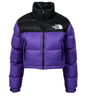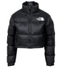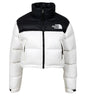 The North Face W Nuptse Short jacket, short model, features a boxy fit, made in the original shiny ripstop fabric and recycled fabric inserts for nature conservation, high collar with fold-in hood, zippered front closure, zippered pockets, long sleeves with Velcro cuffs, embroidered logo on front and back back.