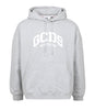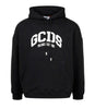 GCDS Logo Loose model hoodie with drawstring hood, long sleeves, front pocket and sewn logo on chest. Regular fit. The model is 1.75m tall and wears an L.