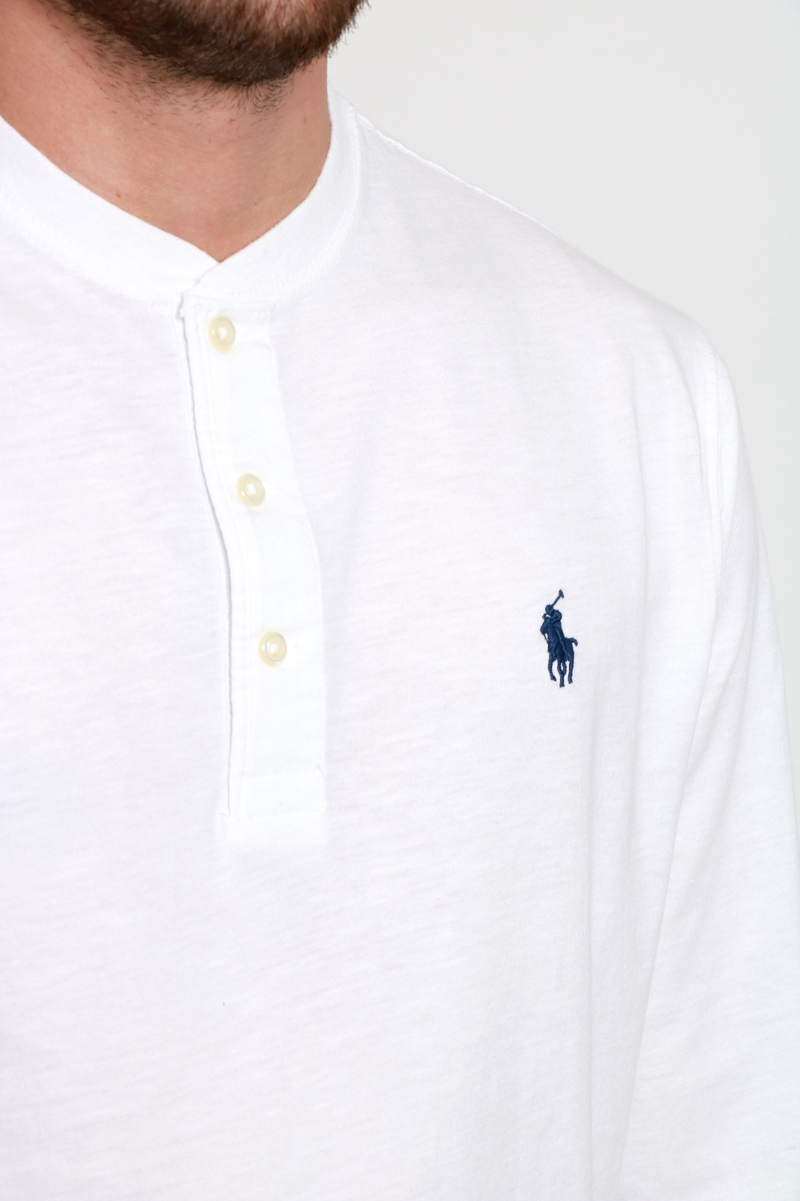 Polo Ralph Lauren T-Shirt in cotton pattern with seraf neckline, three-button closure covered with canvas lapel. Long sleeves, straight hem.