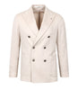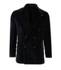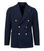 Cotton Tagliatore jacket, double-breasted model with peaked lapels with metal jewel micro logo detail in the buttonhole on the left side, left-side chest welt pocket, front closure with custom buttons, long sleeves with buttons at the cuffs, slit pockets.