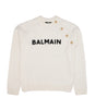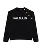 Maglia Balmain Kids in lana e chashmere, girocollo a costine, maniche lunghe con polsini a costine, logo lettering ricamato in rilievo sul fronte, chiusura con bottoni dorati sulla spalla sinistra, fondo con bordo a costine.