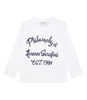 T-Shirt Philosophy di Lorenzo Serafini Kids in cotone nero, con maniche lunghe, girocollo, stampa a contrasto sul fronte "Philosophy di Lorenzo Serafini Est 1984", orlo dritto, sul retro collo stampa lettering Philosophy Est 1984, regular fit.
