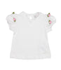T-Shirt Monnalisa realizzata in cotone organico, girocollo, chiusura a goccia con bottoncino sul retro, maniche corte a sbuffo, roselline applicate sulle spalle, logo applicato al fondo sul laterale.