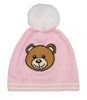Cappello Moschino Baby in misto cotone, con motivo intarsiato da un lato Teddy Bear dall'altro logo, con ponpon in ecopelliccia, bordo con motivo righe orizzontali.