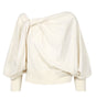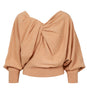 Maglia Alberta Ferretti realizzato in misto lana e seta. Modello dalle linee morbide con tessuto annodato sulla spalla destra, maniche ampie con polsini alti per creare l'effetto a sbuffo fin oltre al gomito.