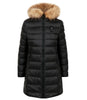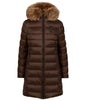 Piumino Blauer Kristin in tessuto tecnico semilucido, modello lungo trapuntato a righe orizzontali con cappuccio fisso e bordo in pelliccia removibile. Il capo perfetto per proteggersi dal freddo.