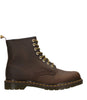 Anfibio Dr Martens 1460. Nato il primo aprile 1960 (1/4/60: l'origine del nome), riconoscibile dalle sue caratteristiche cuciture gialle, suola scanalata e la linguetta AirWair. Grazie alla sua comodità e resistenza, questo stivale era inizialmente prediletto da lavoratori essenziali, le cui mansioni prevedevano lunghe ore in piedi. Punta larga e arrotondata, suola con cuscinetto d'aria. Realizzati in pelle Smooth.
