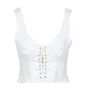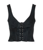 Top Grifoni in cotone modello bustino, smanicato con stringhe incrociate frontali e chiusura con zip posteriore. La modella è alta 1.75m ed indossa una 40.