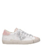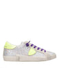 Sneakers Philippe Model Prsx Low relizzata in pelle glitterata e pelle scamosciata. Suola con fresature e sporcature per un effetto vissuto. Tag scudetto sul laterale. Iconica la suola con fasciature artigianali e sporcature.