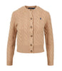 Cardigan Polo Ralph Lauren in morbido misto lana e cashmere cardato, lavorazione a trecce. Girocollo, chiusura a bottoni e bordi a coste, con esclusivo pony ricamato sul lato sinistro del torace.
