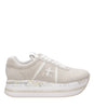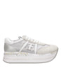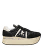 Sneakers Premiata Beth in denim e tessuto ricmato. Logo applicato su entrambi i lati, punta tonda, chiusura frontale con lacci, linguetta con logo stampato, suola logata in gomma.