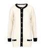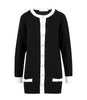 Cardigan nero con rifiniture bianche e chiusura con bottoni dorati.