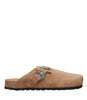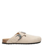 Sabot Taji 140 realizzato in pelle di vitello scamosciato imprezziosito con dettagli in metallo argentato e pietre color turchese. Fascia regolabile con fibbia sulla tomaia.