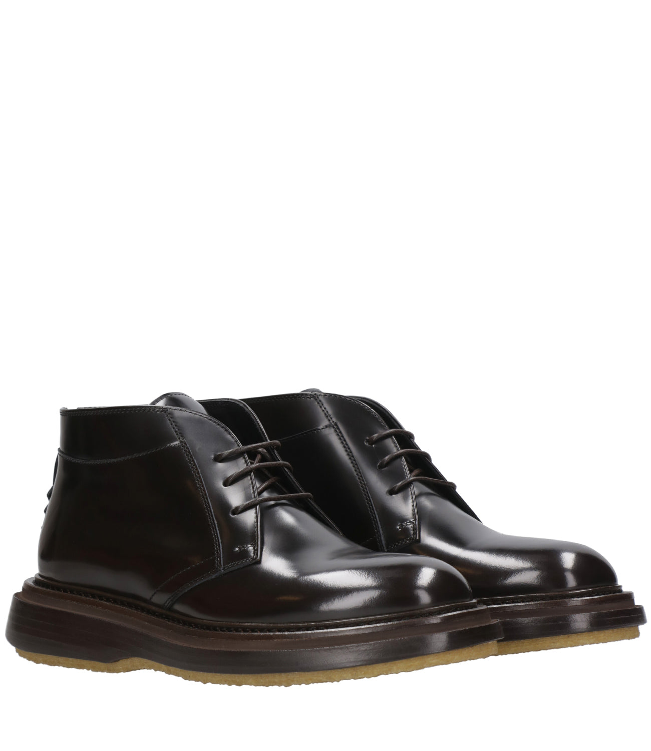 Stivaletto in elegante pelle lucida con inserti elastici laterali, monogramma impresso e suola in gomma con gommini a rilievo.