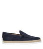 Mocassino Tod's realizzato in pelle scamosciata, linea classica e contemporanea dalla punta arrotondata con impunture a vista, linguetta con monogramma Tod's impresso, suola in gomma con gommini a rilievo e intreccio in rafia sul bordo.